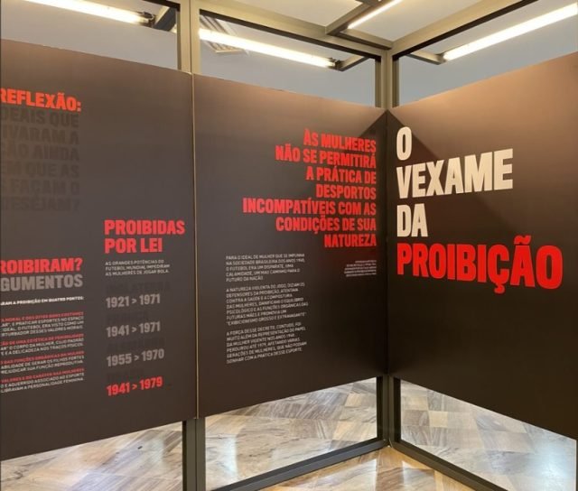 A exposição destaca como as mulheres brasileiras deram um jeito de continuar jogando mesmo sob a proibição – por exemplo, em partidas disputadas como atrações de circo. Em seguida, os visitantes verão como a modalidade começa a se desenvolver depois que a proibição caiu, em 1979, e especialmente após a regulamentação, em 1983, com muita precariedade e falta de apoio até o final da década de 2010 – basta lembrar que a Seleção Feminina de Futebol jogou com uniformes da Seleção masculina até 2019, quando finalmente foi desenvolvido um modelo próprio para mulheres.